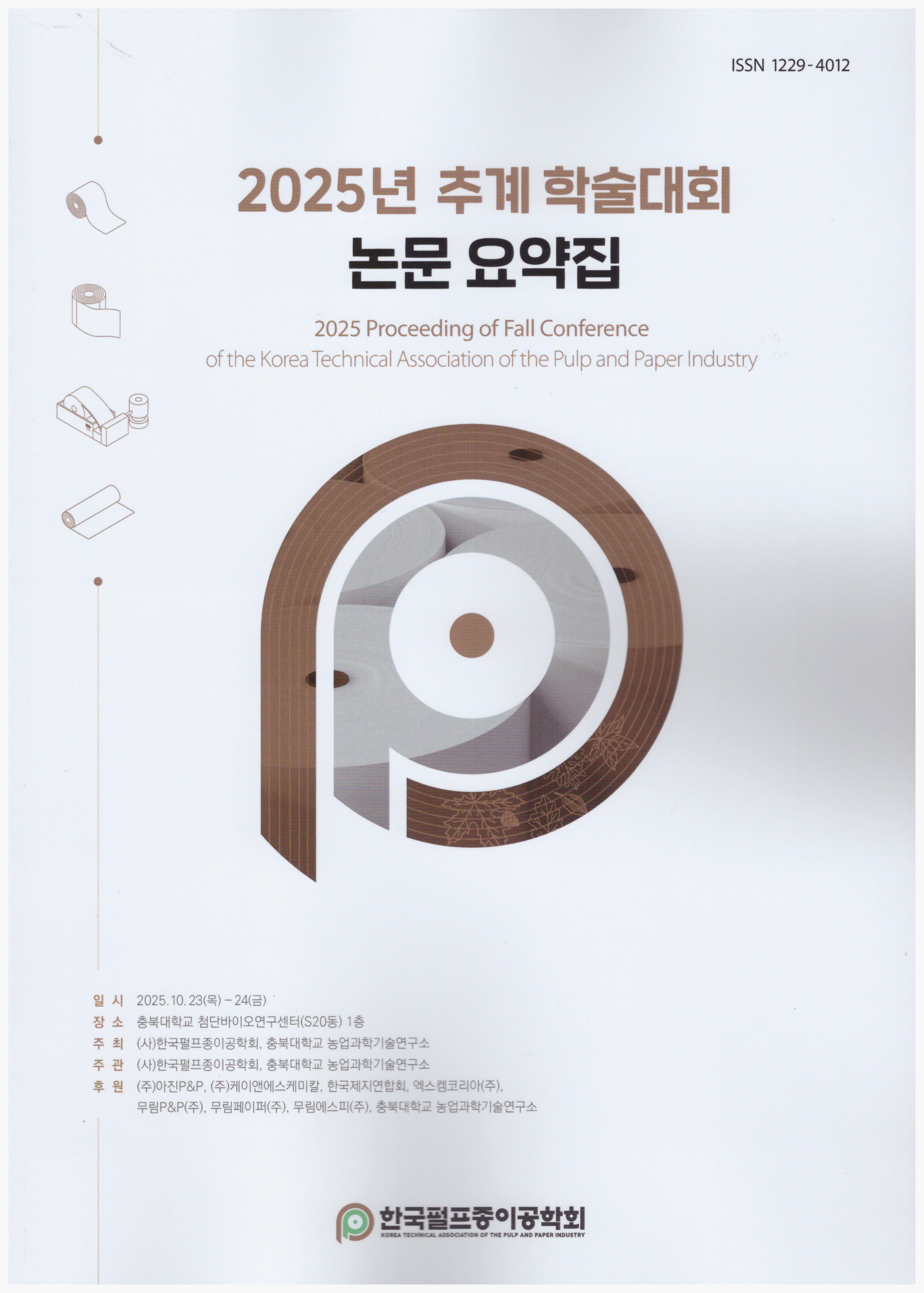 1. 제지산업 폐열원 재활용을 위한 히트펌프 현장 적용 방안 (김진두 / (주)아진P&P) 2. 제지 건조 공정 적용을 위한 히트펌프 및 시스템 구성 (김동호 / 한국기계연구원) 3. 대용량 대온도차 히트펌프 핵심기술 개발 I (이기욱 / LG전자) 4. 고양정 산업용 원심식 히트펌프의 요소기술개발 (정진희 / (주)힉스프로) 5. WEPS, Wet-End 분석을 위한 솔루션 (류정용 / 강원대학교) 6. 제지용 양성전분의 암포테릭-PAM으로의 대체 가능성 (송재필 / 송강산업(주)) 7. Optix™ AI Driven Autonomous Control (Matthew Callicott / Solenis Korea Ltd.) 8. 케미라 건조 지력 증강제 기술 (이진호 / 한국케미라화학(주)) 9. Saving of Chemicals, Water and Energy by Efficient Chemical Mixing Technology 10. 염화팔미토일의 기상 그라프트 반응으로 소수화된 수분산 가능 펄프 섬유 기반 내수성 펄프몰드 개발 (김한별 / 강원대학교) 11. 재활용 골판지 백수 내 회분의 선택적 분급을 위한 클리너의 활용 가능성 탐색 (임지웅 / 강원대학교) 12. 메타아크릴화 및 UV 가교를 통한 카르복시메틸셀룰로오스 하이드로젤 증점제의 제조 및 특성 평가 (김혜인 / 서울대학교) 13. Machine Learning Detection and Quantification of Crystalline Cellulose in Cellulosic Materials using Infrared Spectroscopy (이용주 / 국민대학교) 14. 펄프 몰드 포장재의 경제성 향상을 위한 충전제 적용 가능성 연구 (이지홍 / 현대자동차) 15. The Water Circulation in Papermaking: Sustainable Technologies and Innovative Approaches (배영한 / 에스엔에프코리아(주)) 16. 나노셀룰로오스를 이용한 센서 활용 기술 (권재경 / 국립산림과학원) 17. Nanocellulose as a Key Component Enabling High Performance Li-Ion Batteries (김재환 / 한국과학기술연구원) 18. 셀룰로오스 나노섬유 특성 평가 기반 공정관리 시스템 개발 (최진혁 / 한솔제지) 19. 펄핑 및 바이오매스 공정 기술(poster) 20. 제지공정 및 물성 기술(poster) 21. 셀룰로오스 활용 기술(poster) 22. 재활용 섬유 활용 기술(poster) 23. 기타(poster)