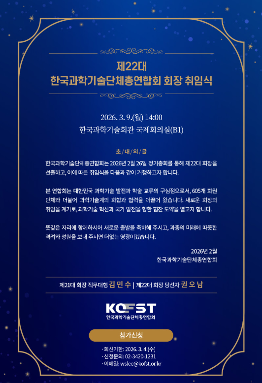 한국과학기술단체총연합회는 2026년 2월26일 정기총회를 통해 제22대 회장을 선출하고, 이에 따른 취임식을 다음과 같이 거행하고자 합니다. 아래 내용을 참조하셔서 많은 참가 신청 바랍니다.
